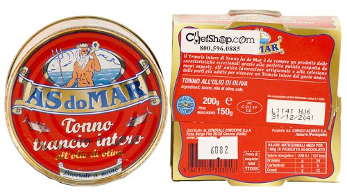 One of our very favorite products, this beautiful, versatile tuna is line-caught, processed when fresh, and packed in olive oil - you can't miss with this! As do Mar, a popular brand in Europe, it's wonderful in a variety of recipes and great right out of the can. Buy with caution - because after one taste, we've never gone back to grocery-store canned tuna! Serving SuggestionsAs do Mar is our tuna of choice for Salade Niçoise, and it's a perfect addition to any antipasto plate. Or try it on a bed of greens with sliced, ripe tomatoes and a handful of good olives for an easy, delicious and very healthy lunch - no mayo required!About As Do MarOff the southwest coastline of Europe lie the tiny Azores, a chain of Portuguese islands that are right in the middle of prime Atlantic tuna grounds. As Do Mar tuna is line caught, and processed while still fresh. The solid flesh of the yellowfin tuna is richer in fats than albacore, which means that the meat is darker - pink to reddish - and it is moister and richer in flavor. As do Mar tuna was voted one of Saveur magazine's top 100 items for 1998, and it was a Food and Wine favorite for 2005.About the TunaBigeye tuna is a species that travels with schools of yellowfin, but swims beneath them to even greater depths. The result of swimming in this deeper, colder, water is an even higher fat content and richer flavor. Occasionally, bigeye are caught along with the yellowfin and not separated, so you may get a bonus of bigeye in your can! Read more...